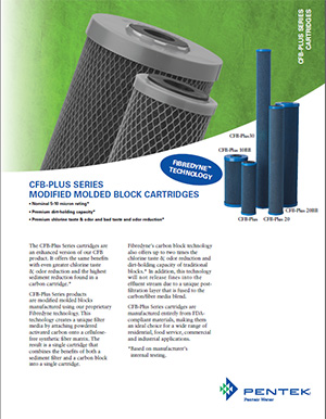 The Pentair CFB-Plus range of modified wet moulded carbon blocks feature enhanced chlorine, taste and odour reduction. Powdered activated carbon is bonded to the fibres, creating an excellent sediment reduction cartridge, which combines the benefits of both a depth filter and carbon block into a single cartridge.